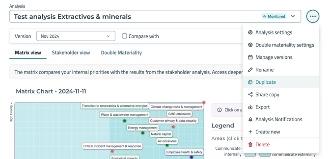 The Duplicate functionality in the materiality Analysis module allows you to keep the same parameters as the original analysis. You can then modify the existing parameters and even compare the results with the original. You can also use this feature to refresh the data by rerunning it.