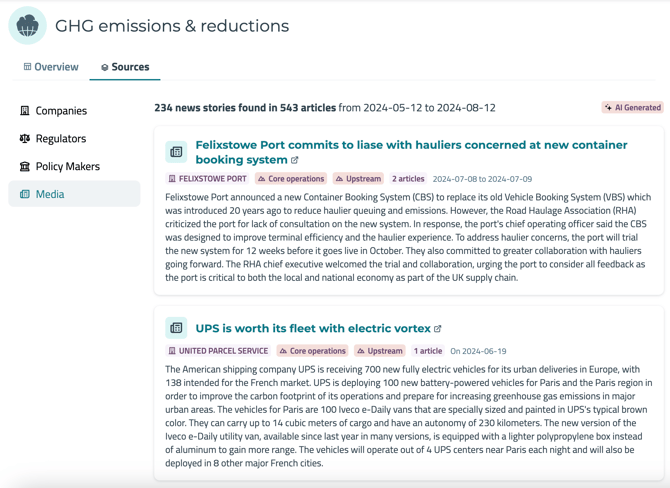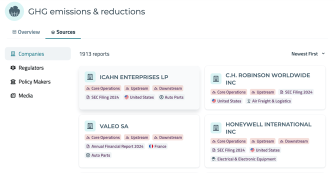 The Companies tab presents the total list of reports included in the topic's analysis. Click on each report card to go to the mentions in the report addressing the topic.