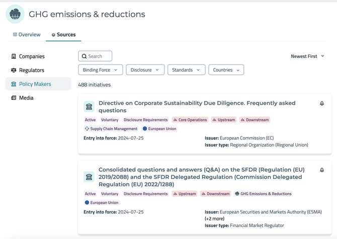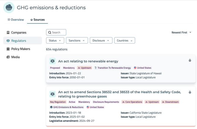 The Policy Makers tab presents the total list of mandatory regulations included in the topic's analysis. Click on each regulation card to get more information on the regulation.